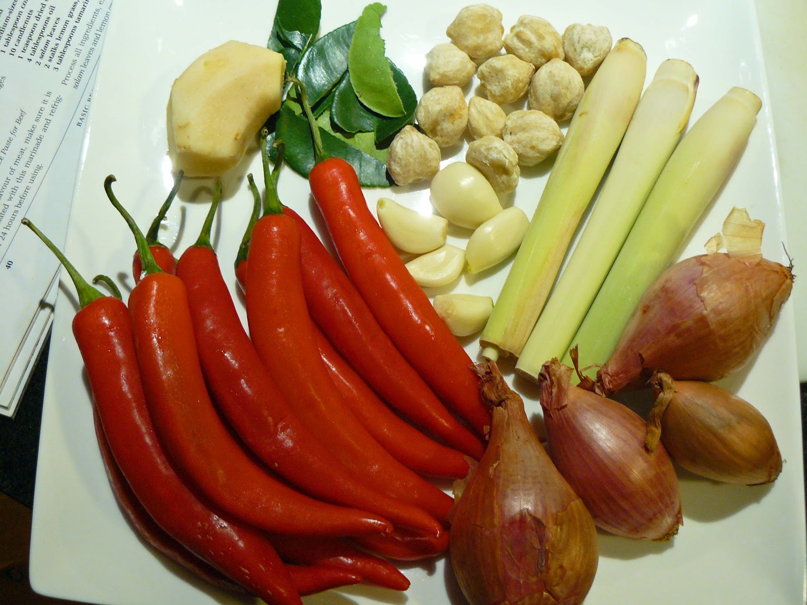 I love the colours of the ingredients, the candlenuts are the crinkly looking things next to the garlic and lemongrass.
