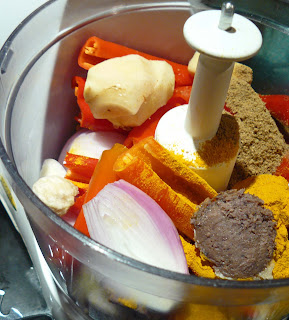 Everything except the lemongrass, tamarind and lime leaves gets thrown into a food processor. Actually, the recipe asked for Salam leaves, but I used Kaffir lime leaves as I love them and have a tree.